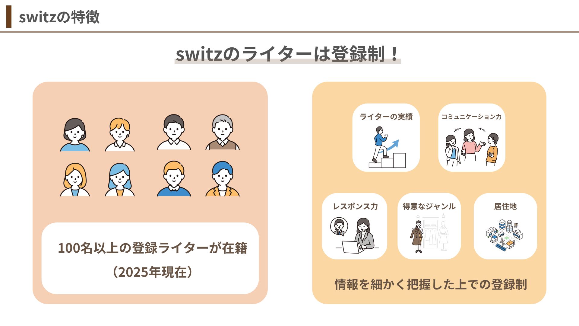 当社の事業内容は、主にウェブライティングサービスを提供しています。ライティング全般を承っており、特に多い案件としては、SEOコラム記事の作成や、企業様の代表の方、社員の方、あるいはエンドユーザー様へのインタビュー記事作成などです。業種を問わず幅広く対応しており、その他にはLPライティング、動画シナリオ作成、翻訳案件なども手掛けています。現在、105名のライターが在籍しており、幅広い案件に対応できるのが弊社の強みです。お客様のニーズに合ったライターを選定できるため、「一貫して対応」できる点も評価いただいております。